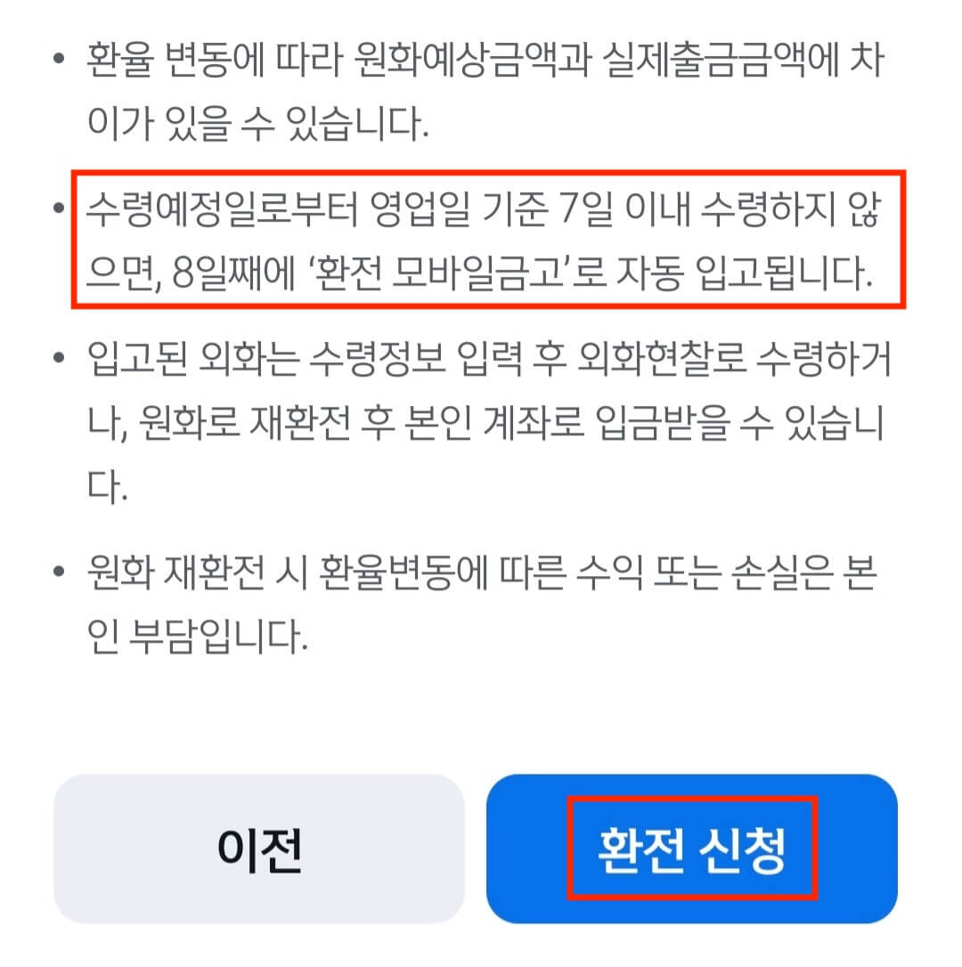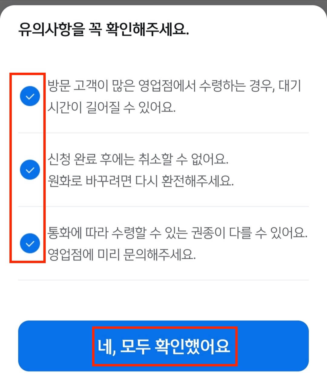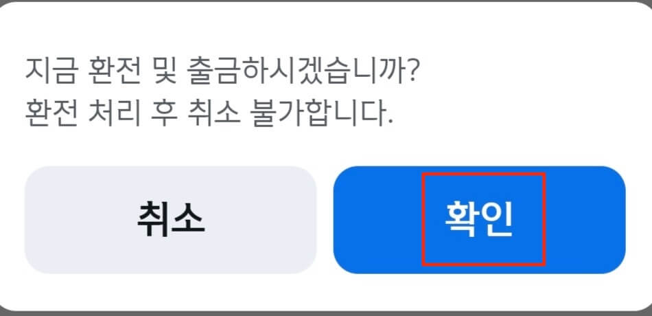 7. 유의사항 항목에 모두 체크를 하고 환전 처리 안내문을 읽고 확인을 클릭합니다.