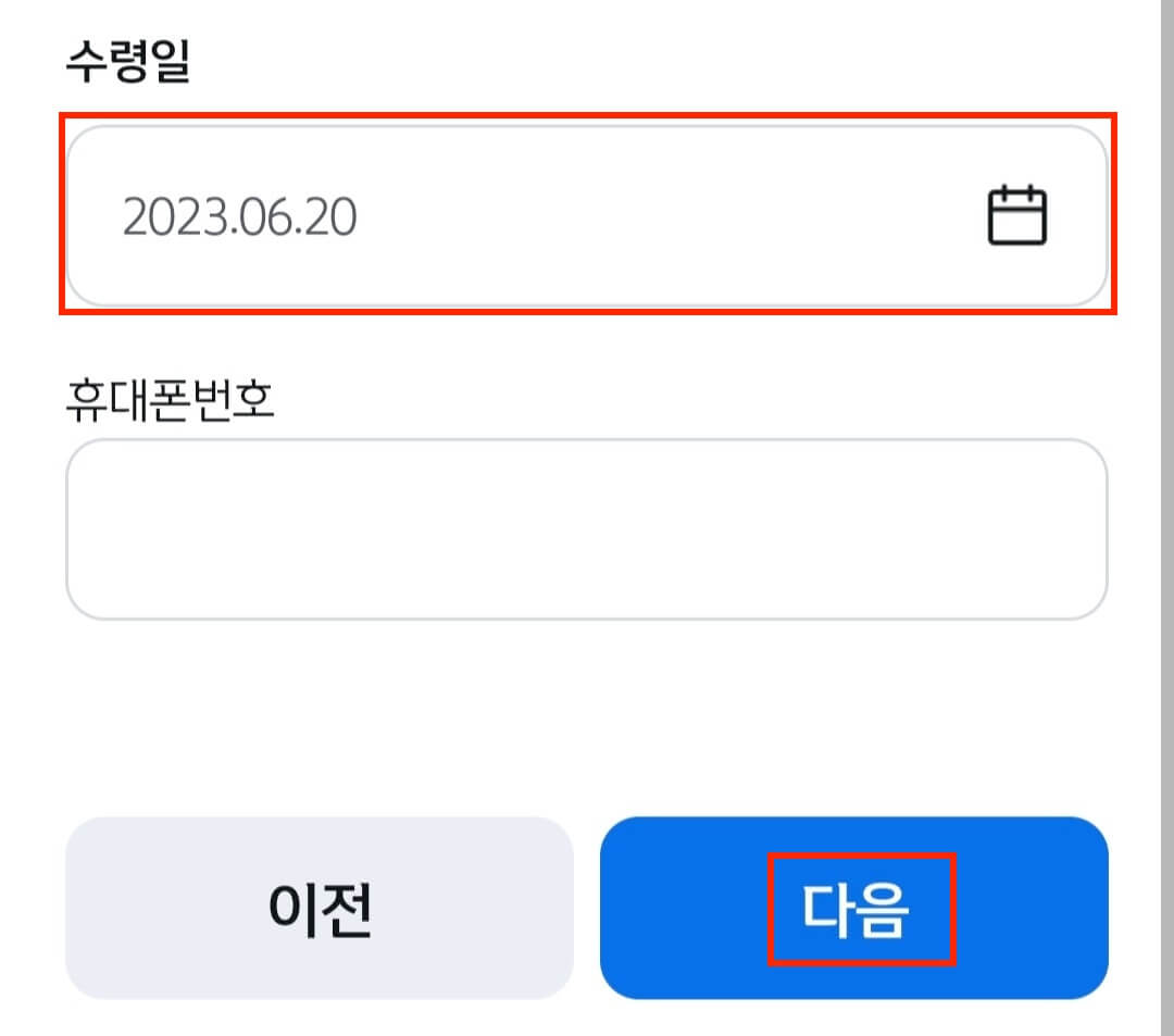 6. 수령일을 선택하고 다음을 클릭합니다. 이후 출금 가능한 계좌를 선택하고 이때 마이신한포인트가 있다면 환전에 사용하실 수도 있습니다. 앞서 언급한 것처럼 영업점에서 수령을 하지 않은 상태를 유지하면 8일째에 자동으로 모바일금고로 보관됩니다.
