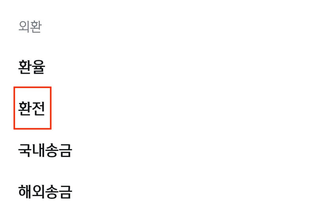 2. 카테고리 스크롤을 아래로 내려서 외환 → 환전을 클릭합니다.