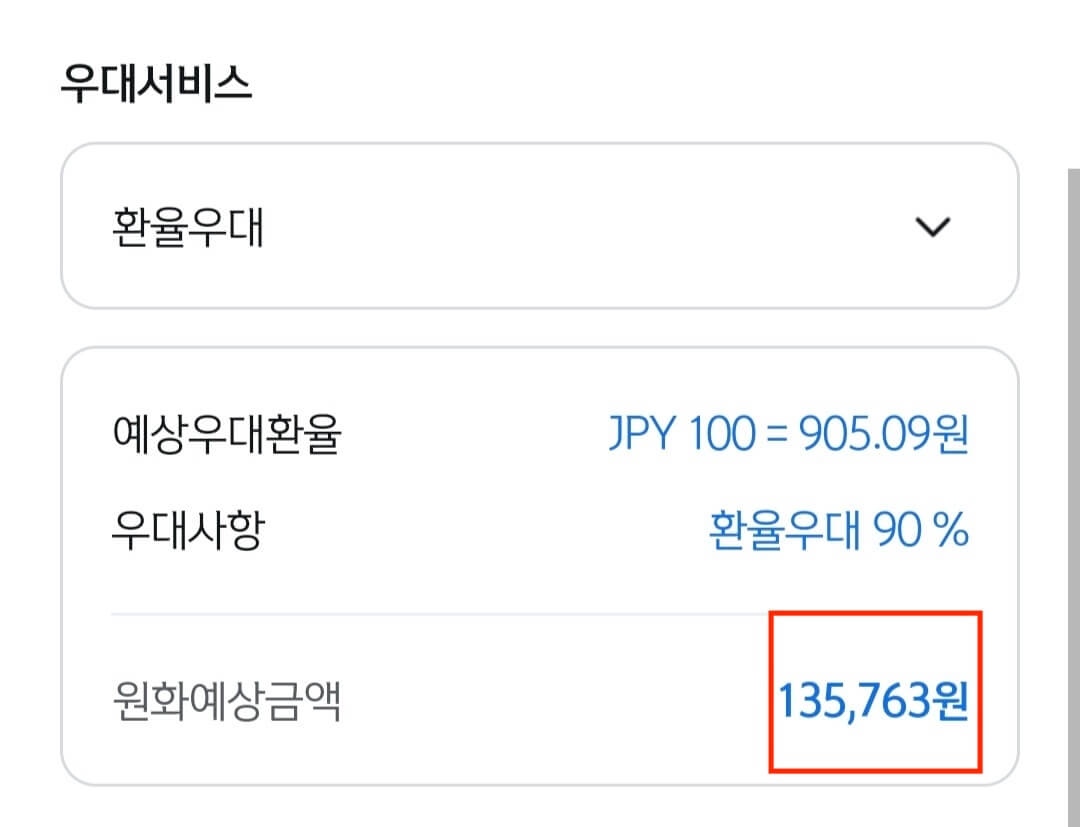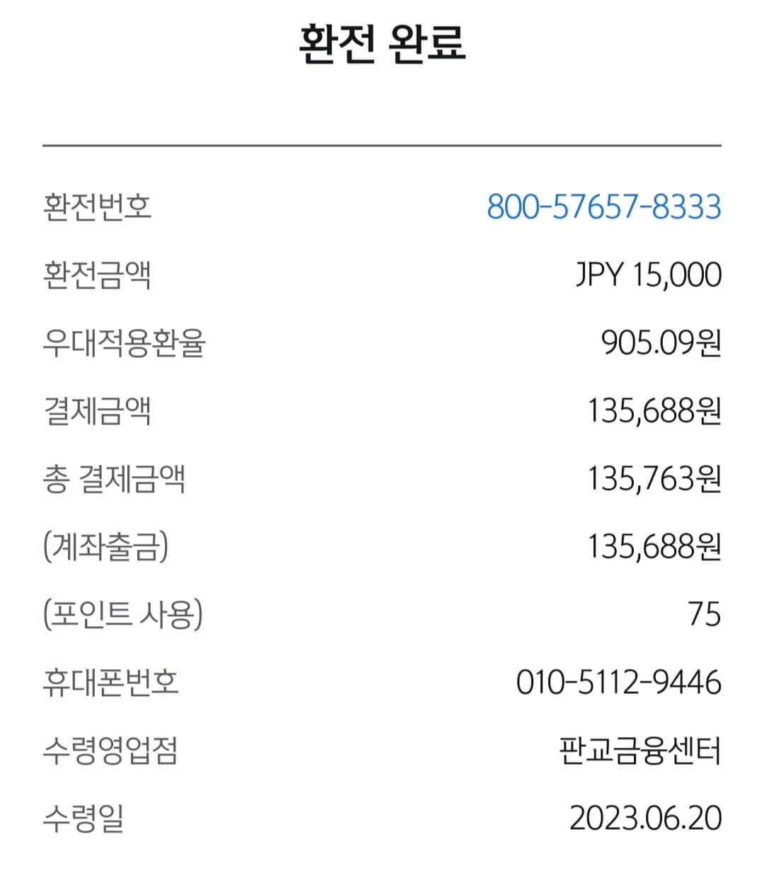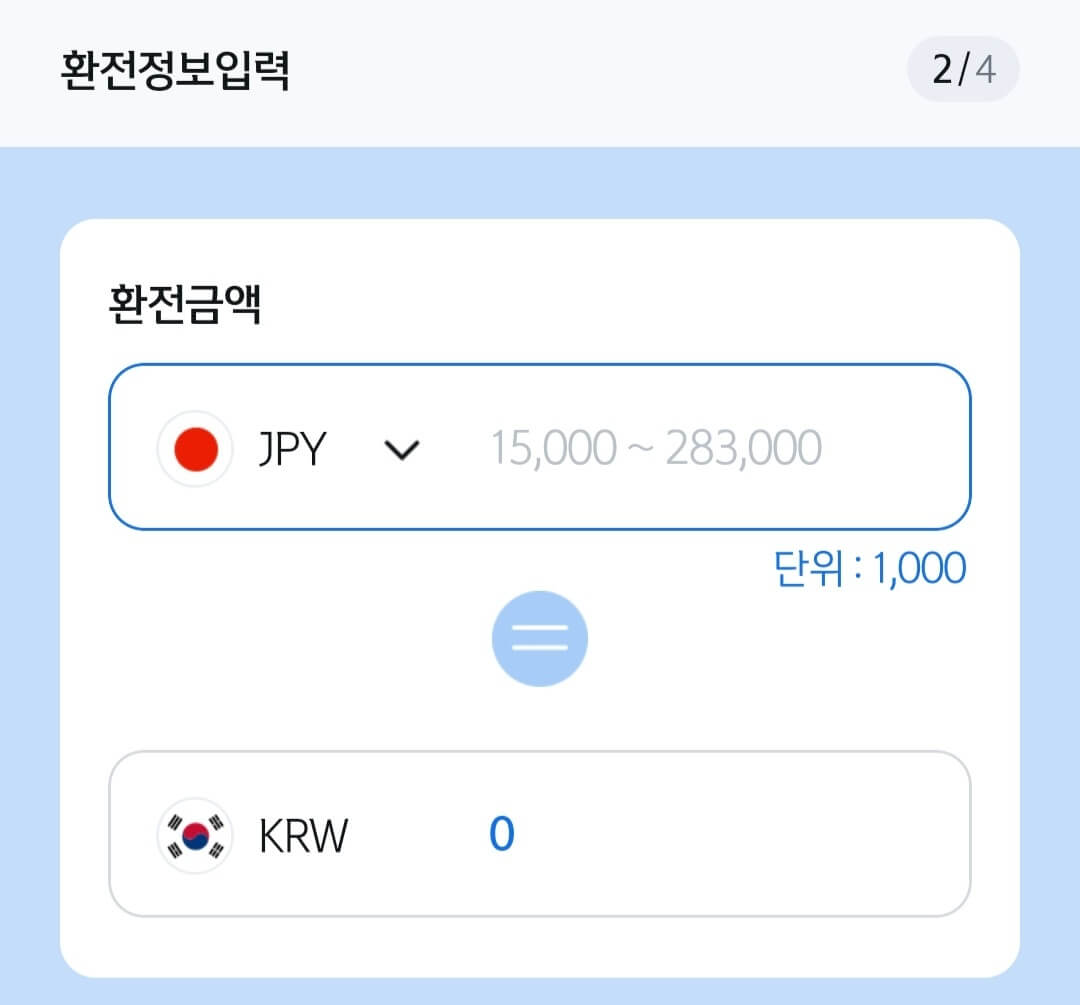 5. 환전 정보를 입력하는 칸이 나옵니다. 엔화의 경우 1회 환전마다 최소 15,000엔 부터 최대 283,000엔을 환전할 수 있습니다.(단위는 1,000엔) 2023년 6월 19일 오후 5시 기준 환율 우대 90%를 적용받아서 15,000엔화를 환전할 경우 원화로는 135,763원 정도가 예상됩니다.