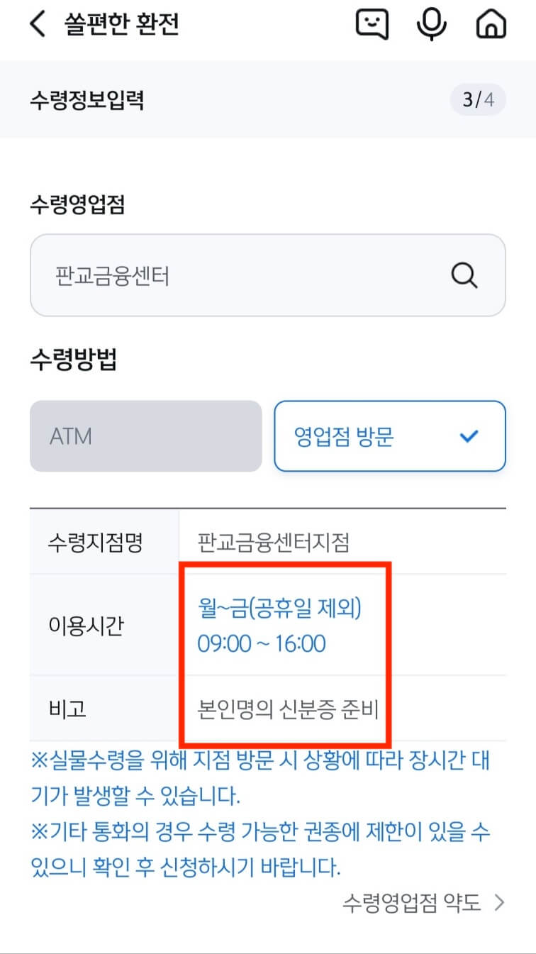 이후 엔화를 수령할 영업점을 선택합니다. 영업점의 경우 월 ~ 금 09:00 ~ 16:00 사이에만 이용 가능합니다.