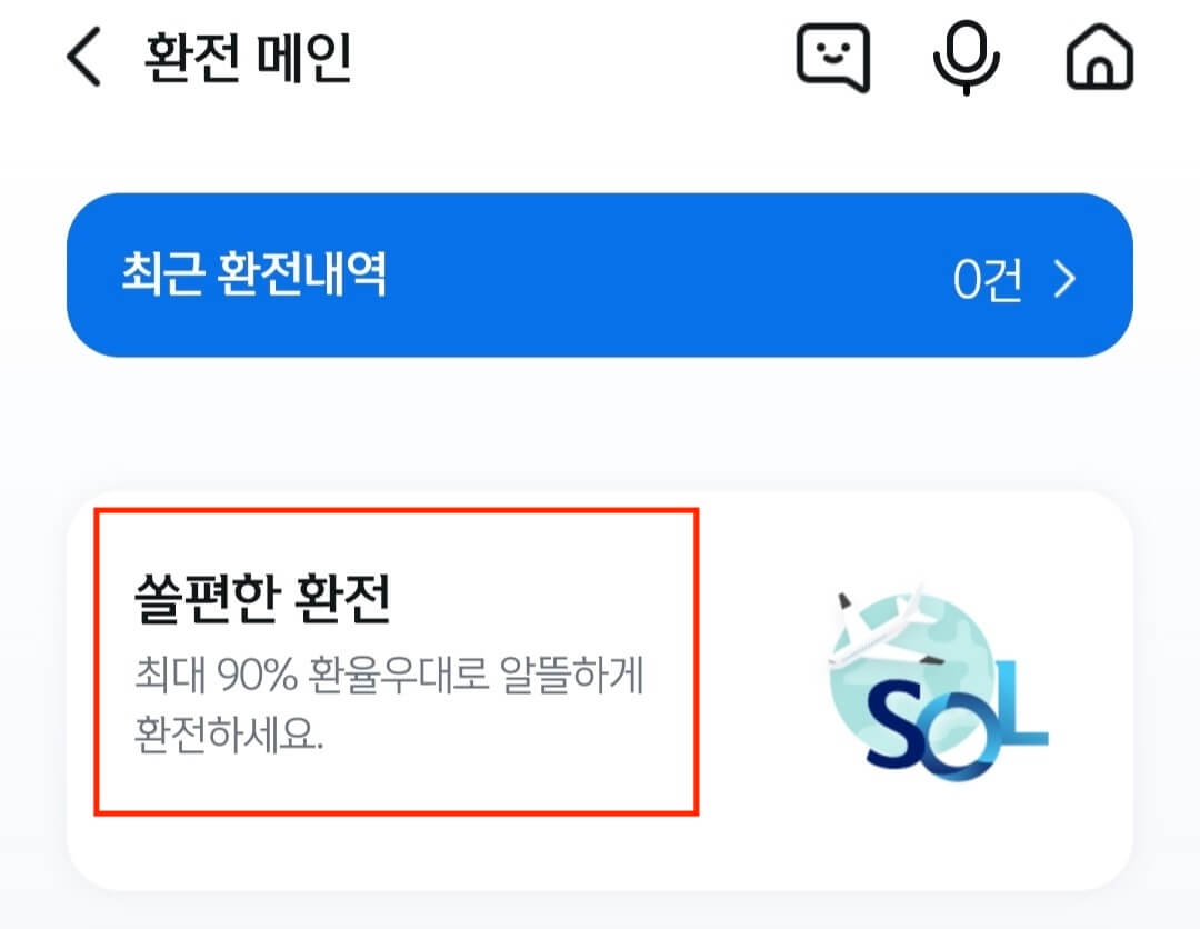 3. 환전 메인 화면에서 쏠편한 환전을 클릭합니다. 외환 공지사항 확인 후 환전하기를 클릭합니다.