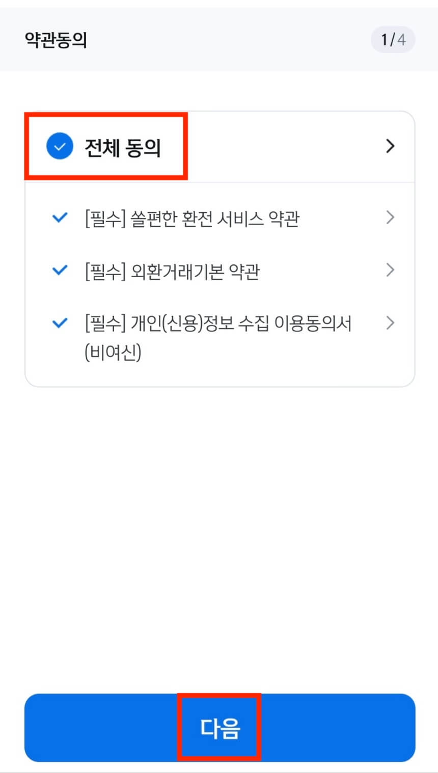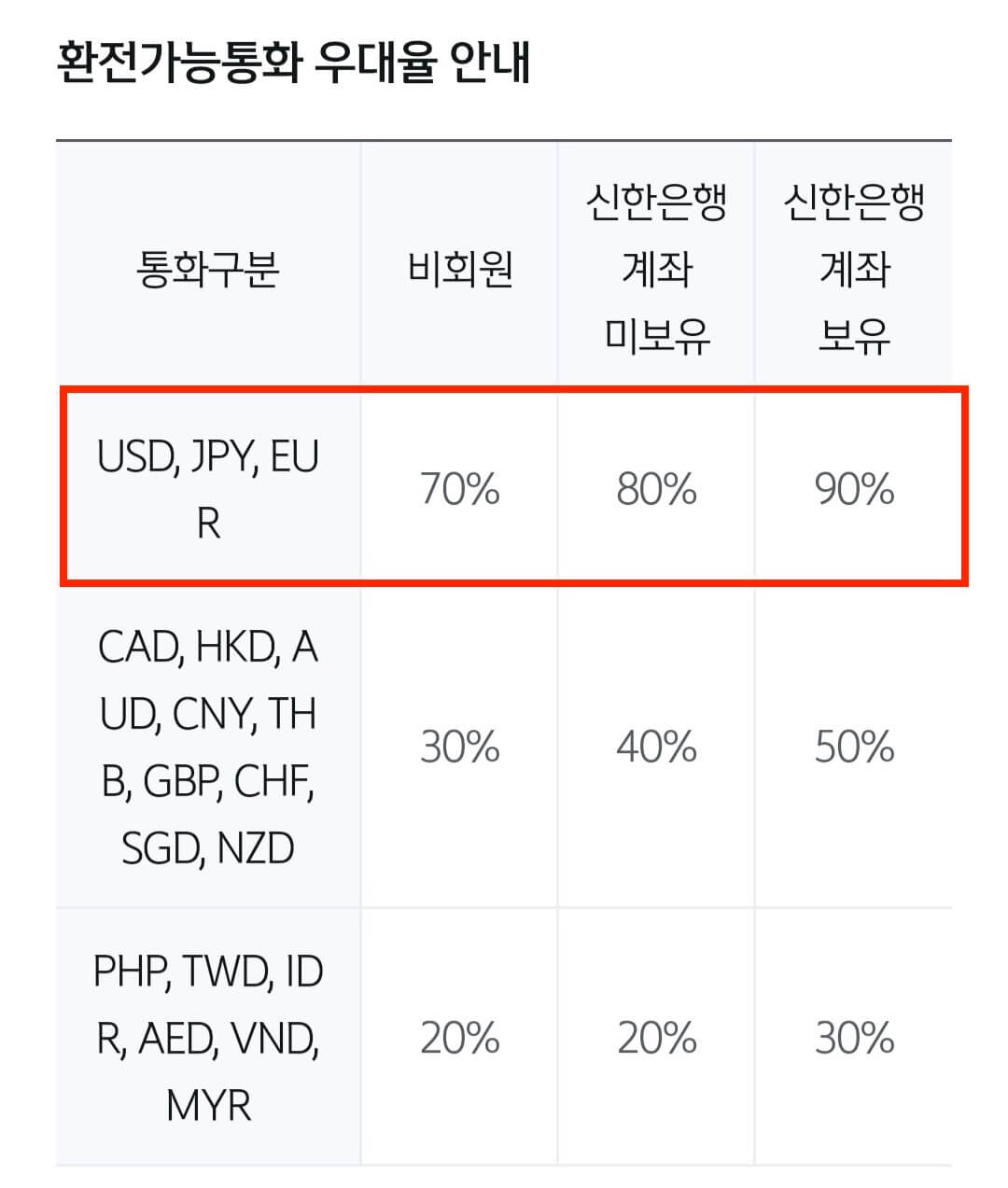 4. 환전가능통화 우대율의 경우 신한은행 계좌를 보유하고 있다면 90% 우대 혜택을 받을 수 있습니다. 약관동의는 전체 동의를 체크해주세요.