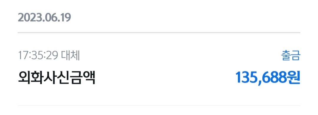 8. 이로써 환전이 완되었습니다. 출금 계좌로 가보면 외화사신금액 명목으로 135,688원이 출금된 것을 확인할 수 있습니다.