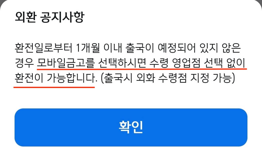 ✅ 외화 환전의 경우 신청은 모바일로 해도 수령은 영업점에 방문하여 가능합니다. 단 환전 신청일로부터 1개월 이내에 출국 예정이 없다면 영업점에 방문하지 않고 8일이 지나면 자동으로 모바일금고로 환전액이 보관됩니다.