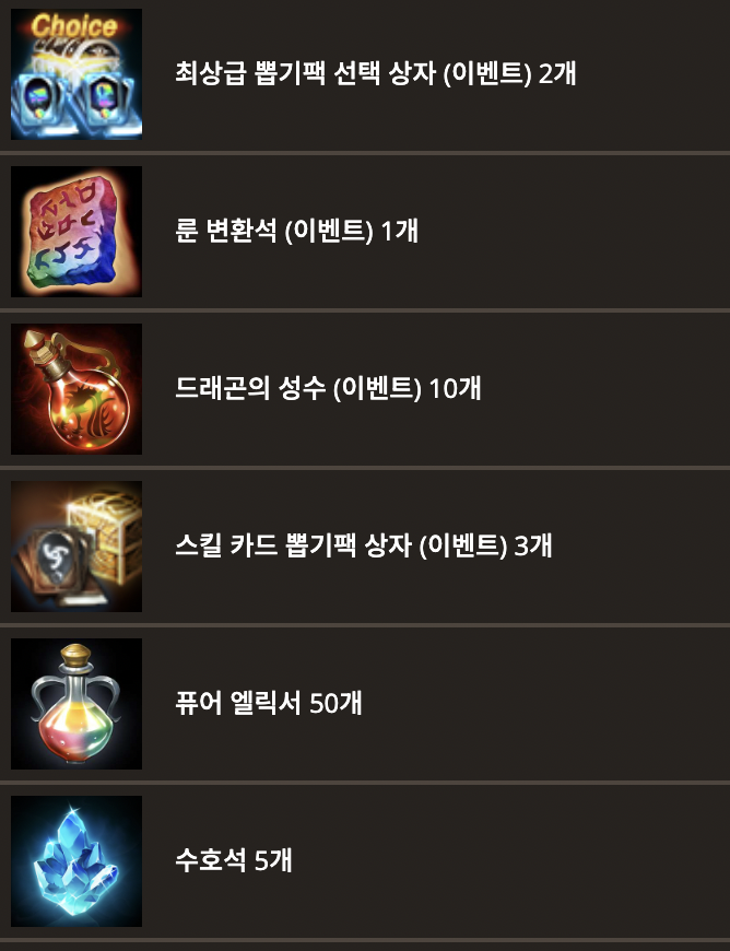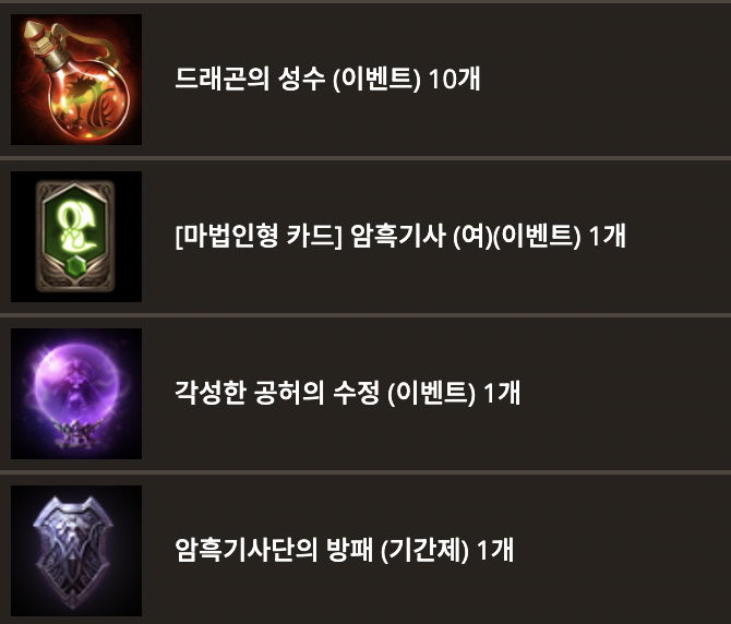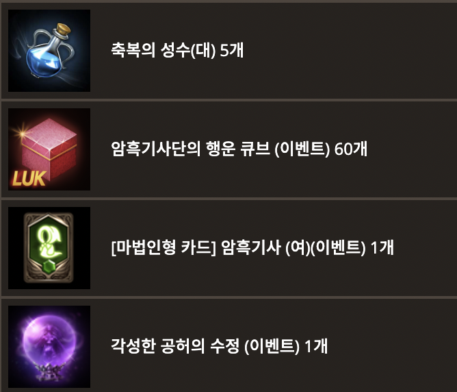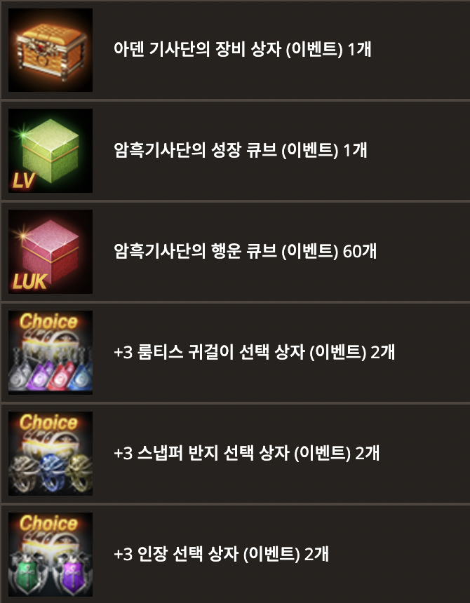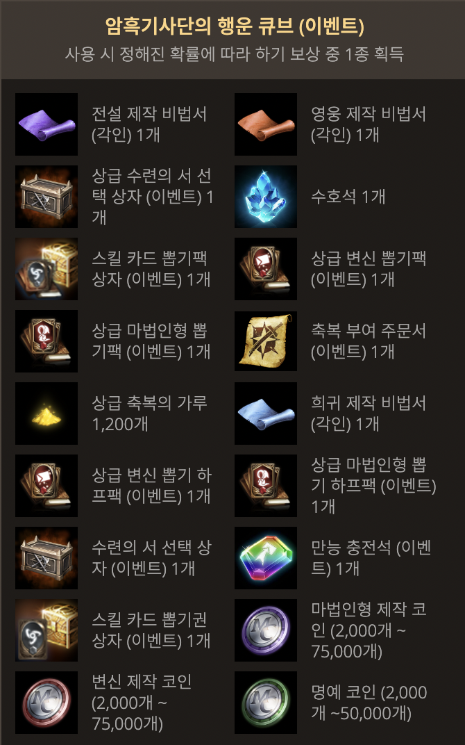 암흑기사단의 행운 큐브(이벤트) 60개 상자의 경우 22시간 마다 한 번씩 상자를 개봉할 수 있으며 상자목록은 위 이미지를 참고하시면 됩니다.