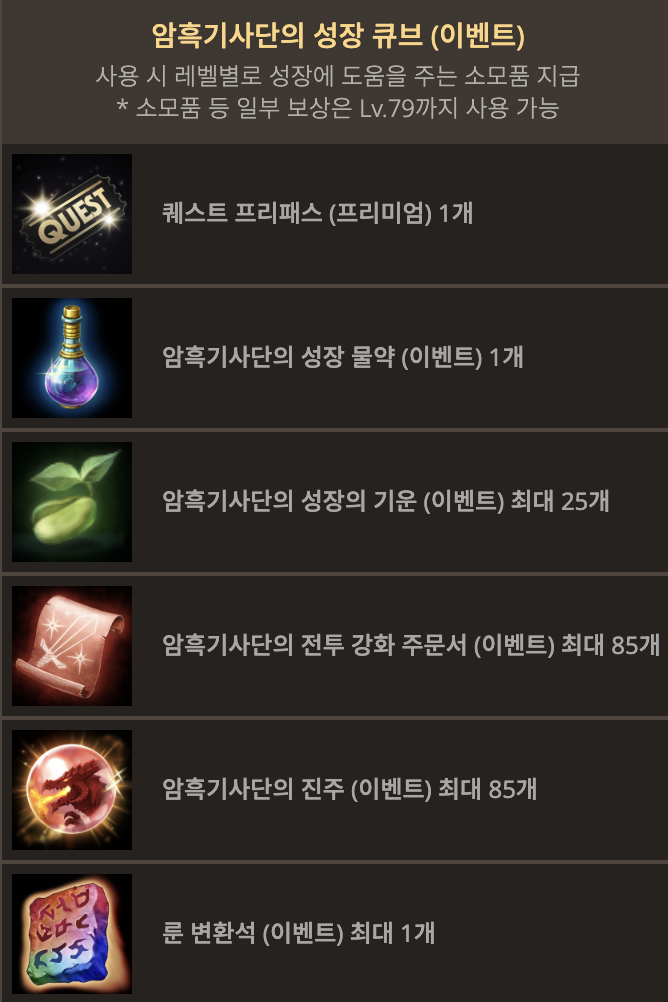 성장 지원 상자에서는 성장 큐브를 따로 지급해주고 있는데요 레벨업을 할 때마다 보상이 주어집니다. 또한 성장 지원의 핵심이라고 할 수 있는 암흑기사단의 성장 물약(이벤트)를 지급해주기 때문에 해당 물약을 섭취하게 되면 700% 경험치 버프가 주어져서 빠른 레벨업이 가능하게 됩니다.