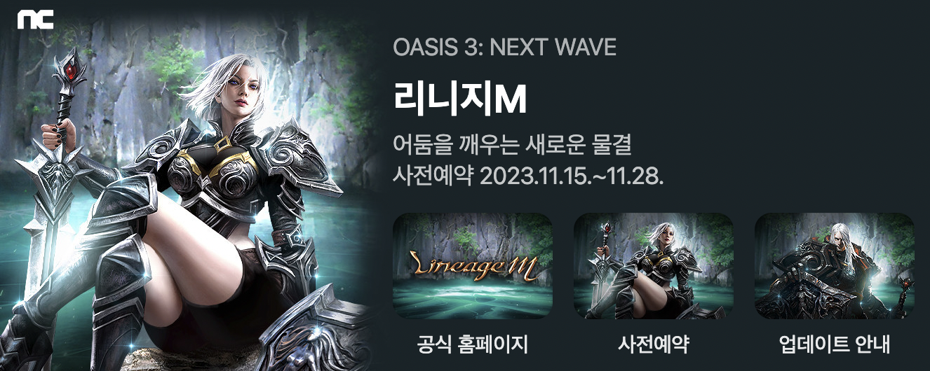 이번 사전예약의 명칭은 리니지m OASIS 3 : NEXT WAVE로 암흑기사 리부트를 중심으로 하고 있습니다. 아마 암흑기사와 더불어 기사도 같이 클래스 리부트가 되지 않을까 생각이 듭니다.