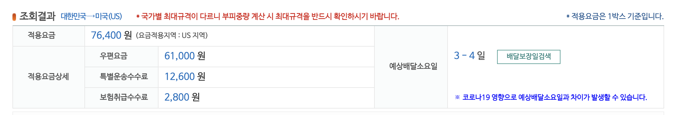 예를 들어 위 항목을 적용시킨 배송품을 대한민국에서 미국으로 EMS를 보낼 때 요금조회를 하면 다음과 같은 금액이 나온다는 것을 확인할 수 있습니다.