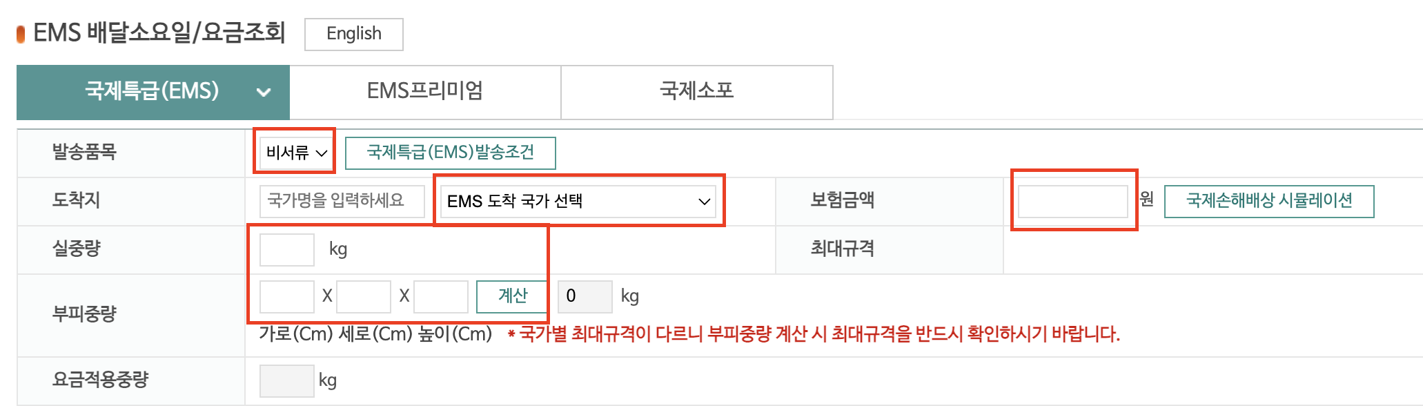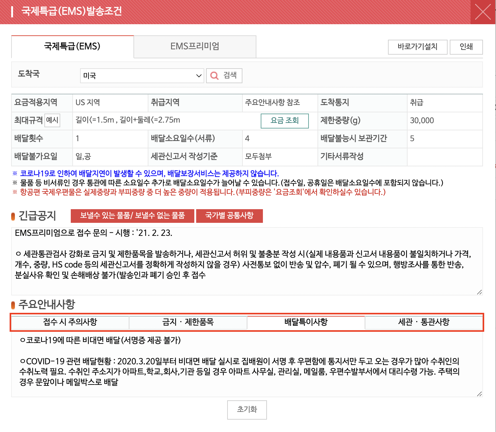 이중에서 가장 일반적인 국제특급(EMS)를 기준으로 배달 소요일과 요금조회 하는 방법에 대한 절차를 보여드리겠습니다.